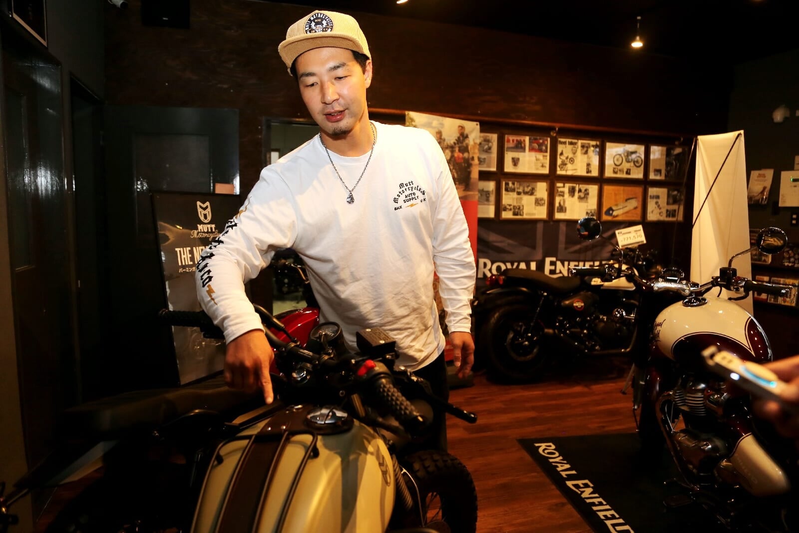 「服が好きなので特に感じるのですが、MUTTはシンプルな白Tとデニムで乗るだけで、すごくサマになるんです」と荻原店長。バイク自体のデザインが完成されているからこそ、乗り手のファッションを選ばない懐の深さがある。もともとおしゃれな方が自身のセンスでMUTTを選ぶケースもあれば、MUTTを手に入れたことをきっかけにファッションに目覚め、装いが変わっていく。そんなお客様の変化を見るのも嬉しいという。