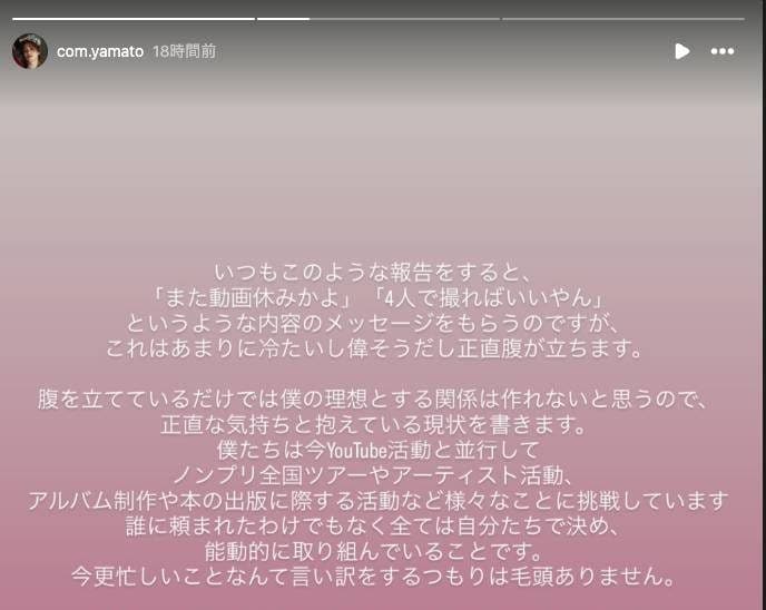 「コムドット」(登録者数413万人)のリーダー「やまと」が27日、インスタグラムを更新。ゆうたの体調不良によるスケジュール変更をめぐり、一部から寄せられた「また動画休みかよ」という批判に対しての心境を綴りました。