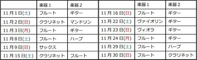 演奏される楽器は日によって異なります。フルートとギターの組み合わせや、クラリネットとマンドリン、ヴァイオリンとギター、サックス(単独)、フルートとハープなど、多彩な組み合わせが予定されています。もちろんプロの方による生演奏!