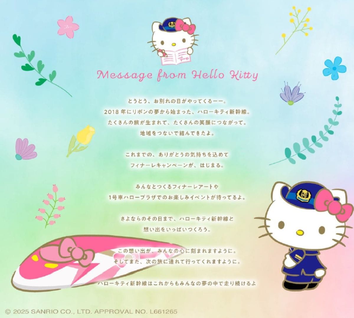 ハローキティ新幹線は「さよならのその日まで、ハローキティ新幹線と想い出をいっぱいつくろう」とメッセージを寄せています。運行終了までのおよそ半年間、ぜひこの特別な新幹線に乗って、思い出に残る楽しい旅におでかけください。