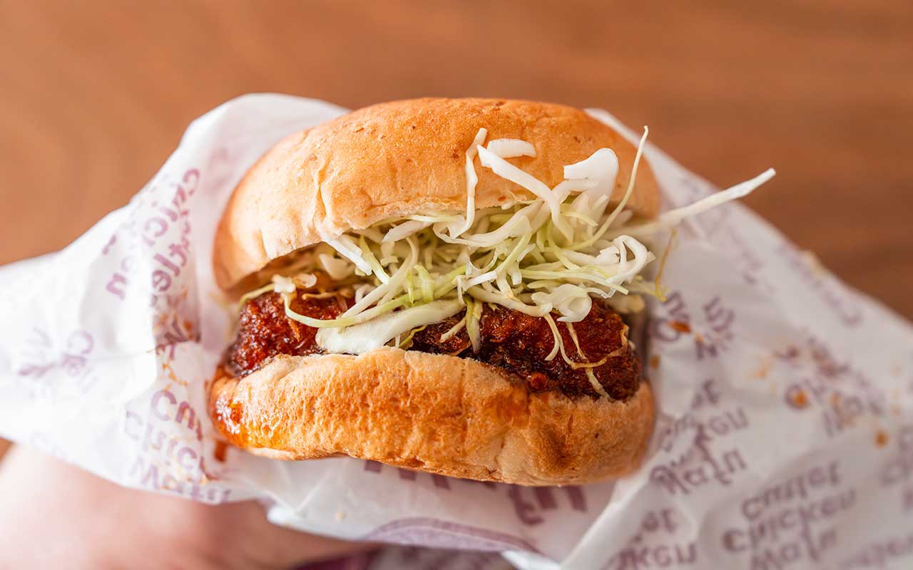 「チキンフィレバーガー」「和風チキンカツバーガー」は、醤油風味のテリヤキソースをたっぷり絡めたチキンカツと、マヨソース、千切りキャベツの組み合わせとなっています。