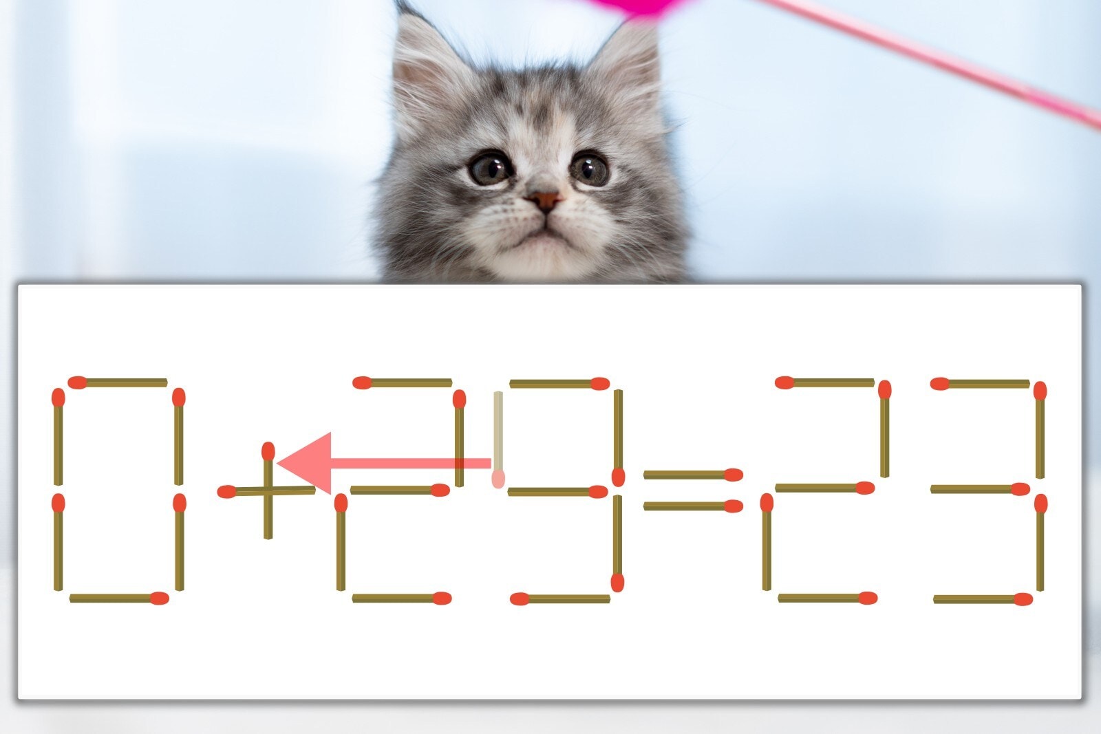 「9」を別の数字に変化させると答えが導き出せます。「9」のマッチ棒を1本移動して、「-」を「+」にしてみましょう。すると、「0+23=23」が成立します。