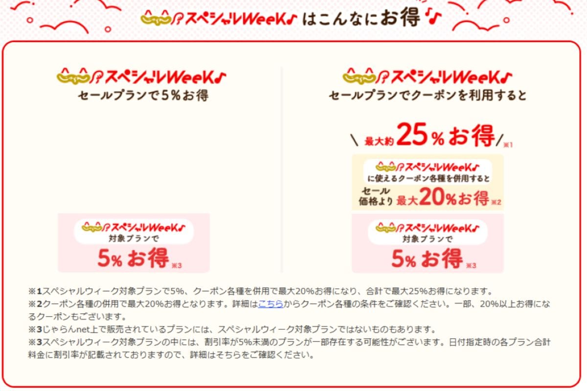 (セールプランで、スペシャルWeekに使えるクーポン利用で最大約25%お得に)