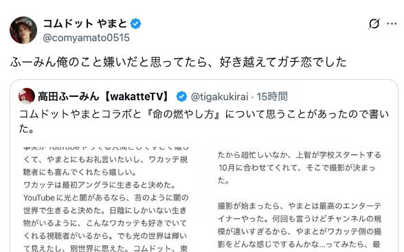 同日中に、ふーみんはXを更新。「動画みんな見てくれた?wakatteがコムドットやまととコラボできました」と切り出すと、「すごく嬉しくて、やまとにもお礼言いたいし、ワカッテ視聴者にも喜んでくれたら嬉しい」と綴りました。
