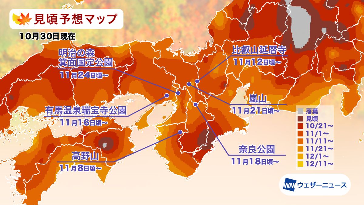 ウェザーニューズの予想では、関東や近畿の主要名所の見頃開始日は以下の通りです。(10月30日現在)