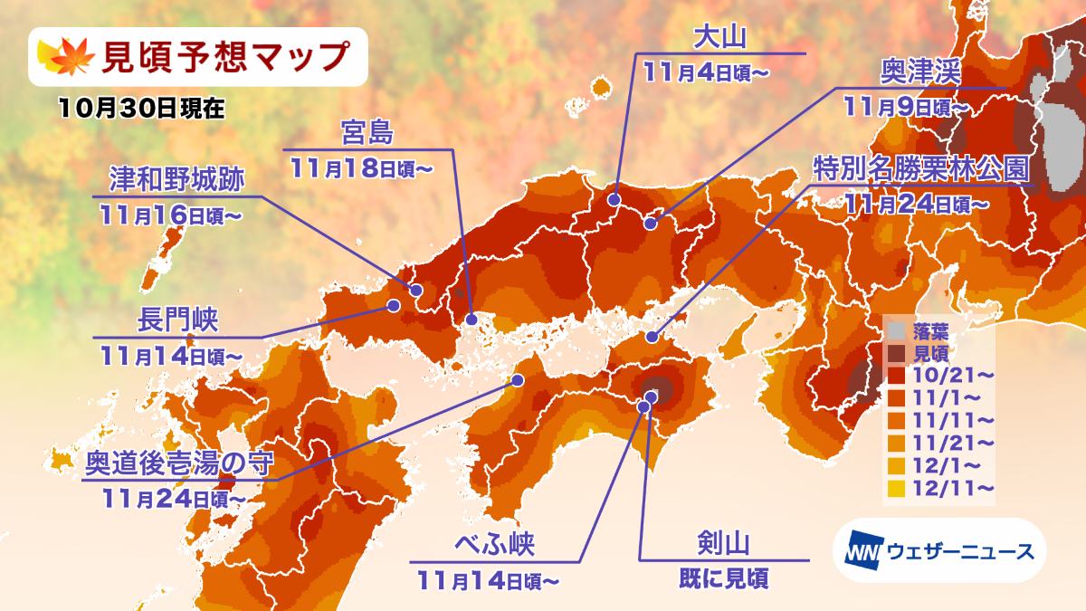 四国・べふ峡(高知県)11月14日頃、 平年並が中心 一部でやや遅れる見込み