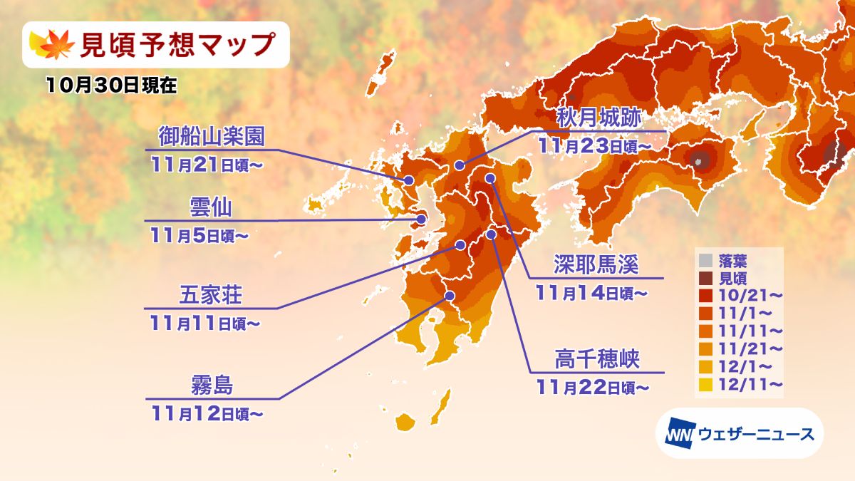 九州では、ここ数日の朝晩の冷え込みでようやく色付きが始まりましたが、平年並〜平年よりやや遅い見頃となる予想です。