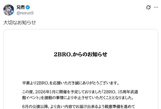 今月1日、兄者はXで「大切なお知らせ」と題した文書を公表し、2026年1月に開催予定だった「2BRO. 15周年武道館イベント」の中止と、おついちの独立を報告しました。中止理由については、「自身の精神的負荷からくる体調の変化が生じ、2BRO.として納得の行くカタチでの武道館公演実施が困難であるという判断に至りました」と説明。関係者とファンに謝罪を述べています。