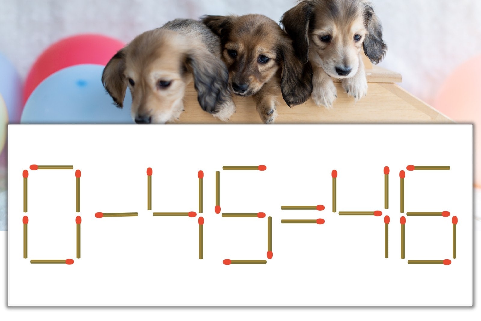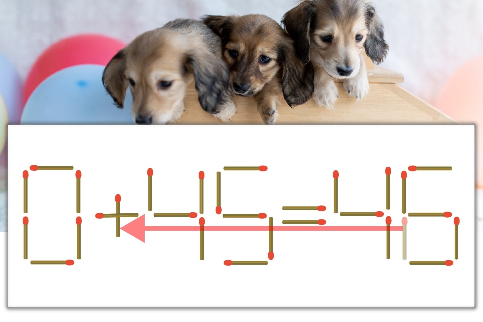 「6」を別の数字に変化させると答えが導き出せます。「6」のマッチ棒を1本移動して、「-」を「+」にしてみましょう。すると、「0+45=45」が成立します。