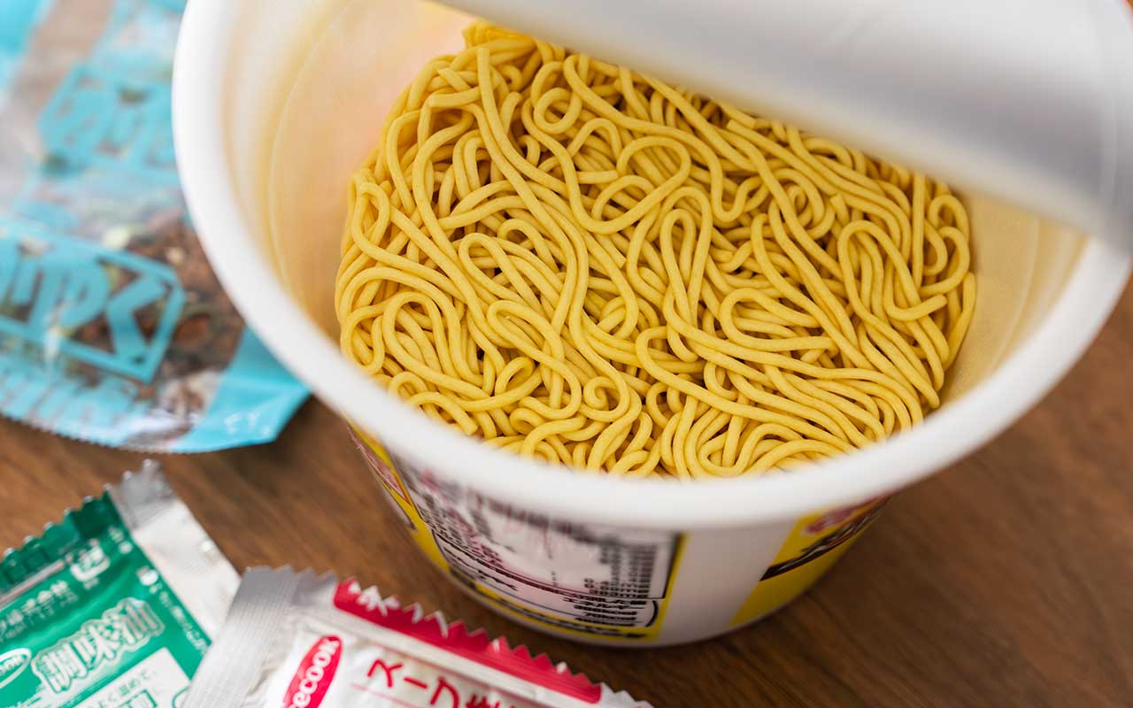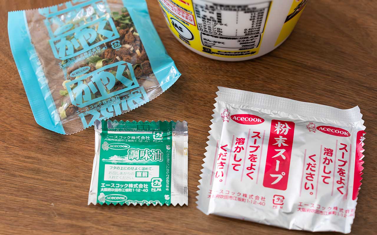 カップの中には、麺と一緒に「粉末スープ」「かやく」「調味油」の袋が入っています。
