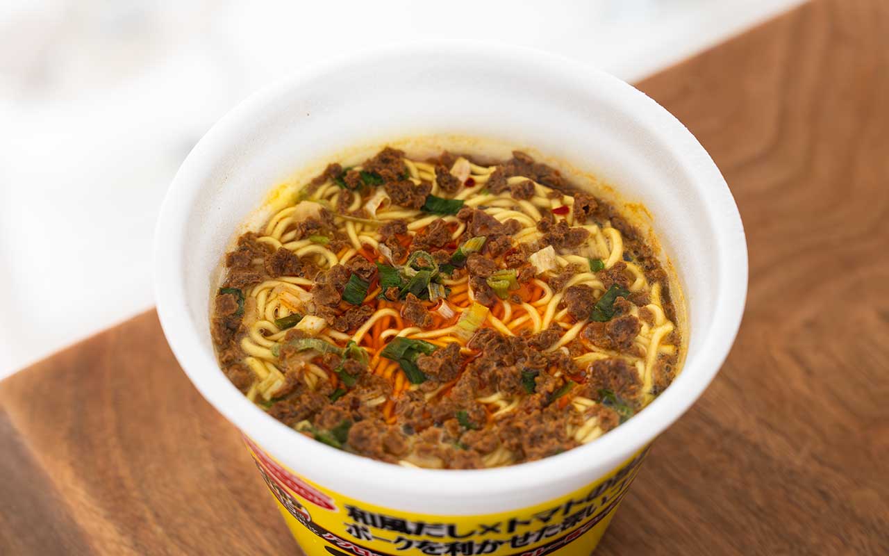 魚介醤油スープをベースに、スパイスやトマトの酸味・旨みをきかせ、味付けした肉そぼろで仕上げた一杯は、チャンネルのファンならずとも、食べごたえのある味わいでしっかり満足できるのだとか。