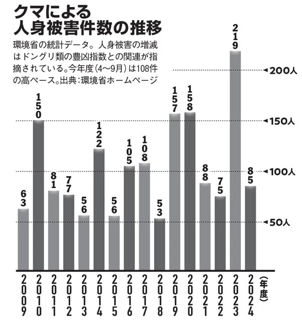 クマ出没の背景には都市部でも山間地でも、さまざまな要因が絡む。主食のひとつであるドングリの不作、過疎化による行動範囲の広域化、食料発見の成功体験などだ。