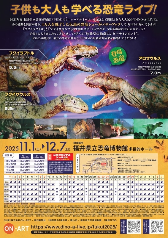 同館は「フクイラプトルやフクイサウルスの生態にもスポットを当て、学びも満載。子どもも大人も楽しめて、見て・感じて・学べる、体験型の恐竜エンターテインメント。福井の恐竜の魅力と、恐竜博物館の最新の研究成果を体感して」とPRしている。