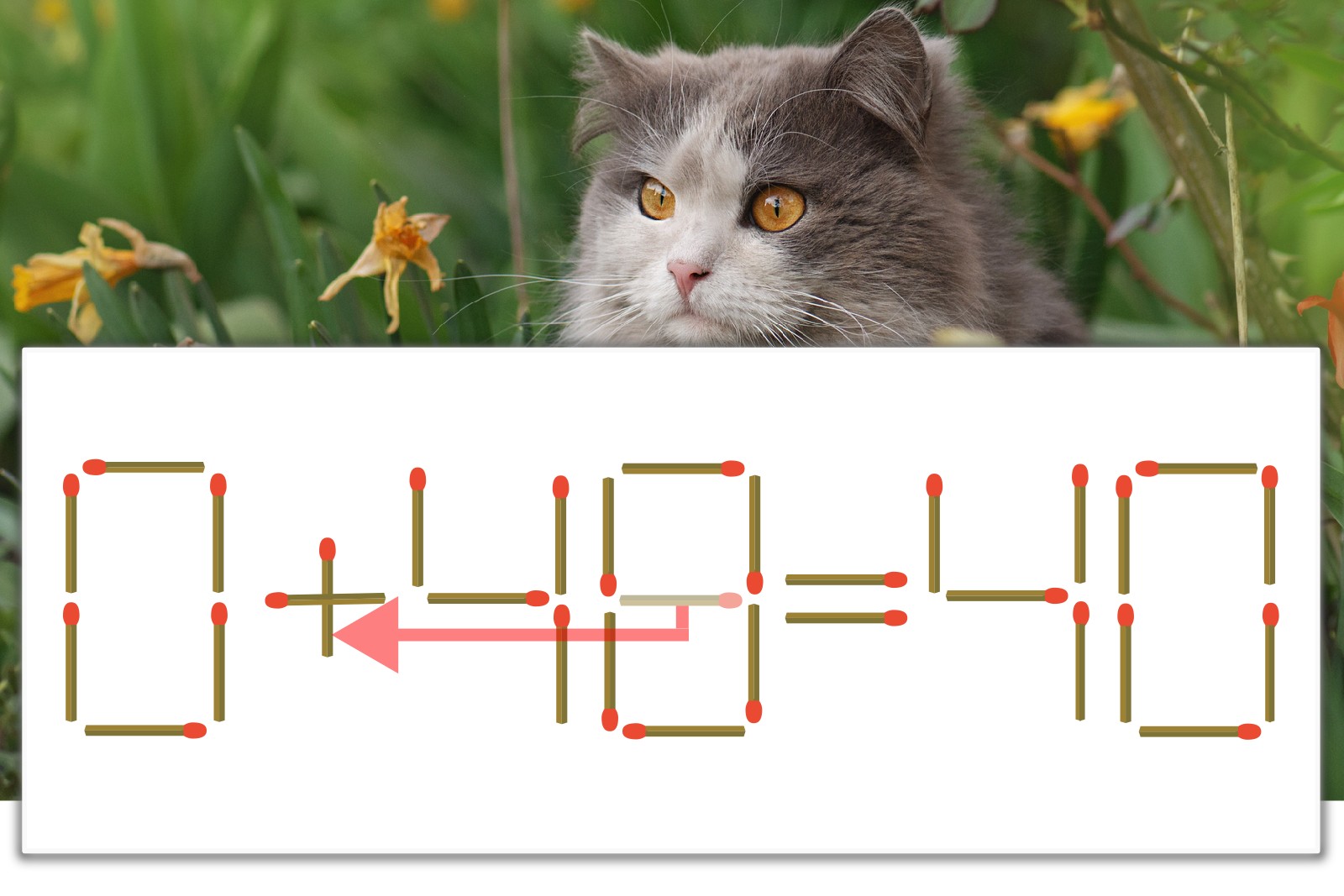 「8」を別の数字に変化させると答えが導き出せます。「8」のマッチ棒を1本移動して、「-」を「+」にしてみましょう。すると、「0+40=40」が成立します。