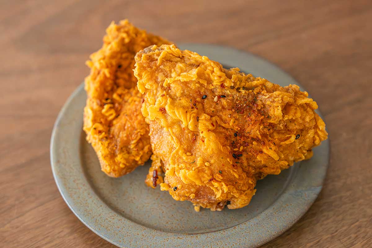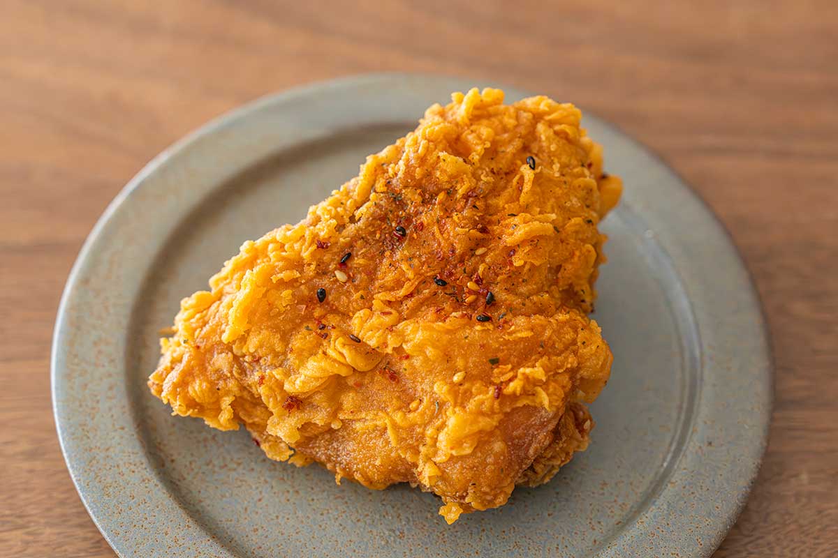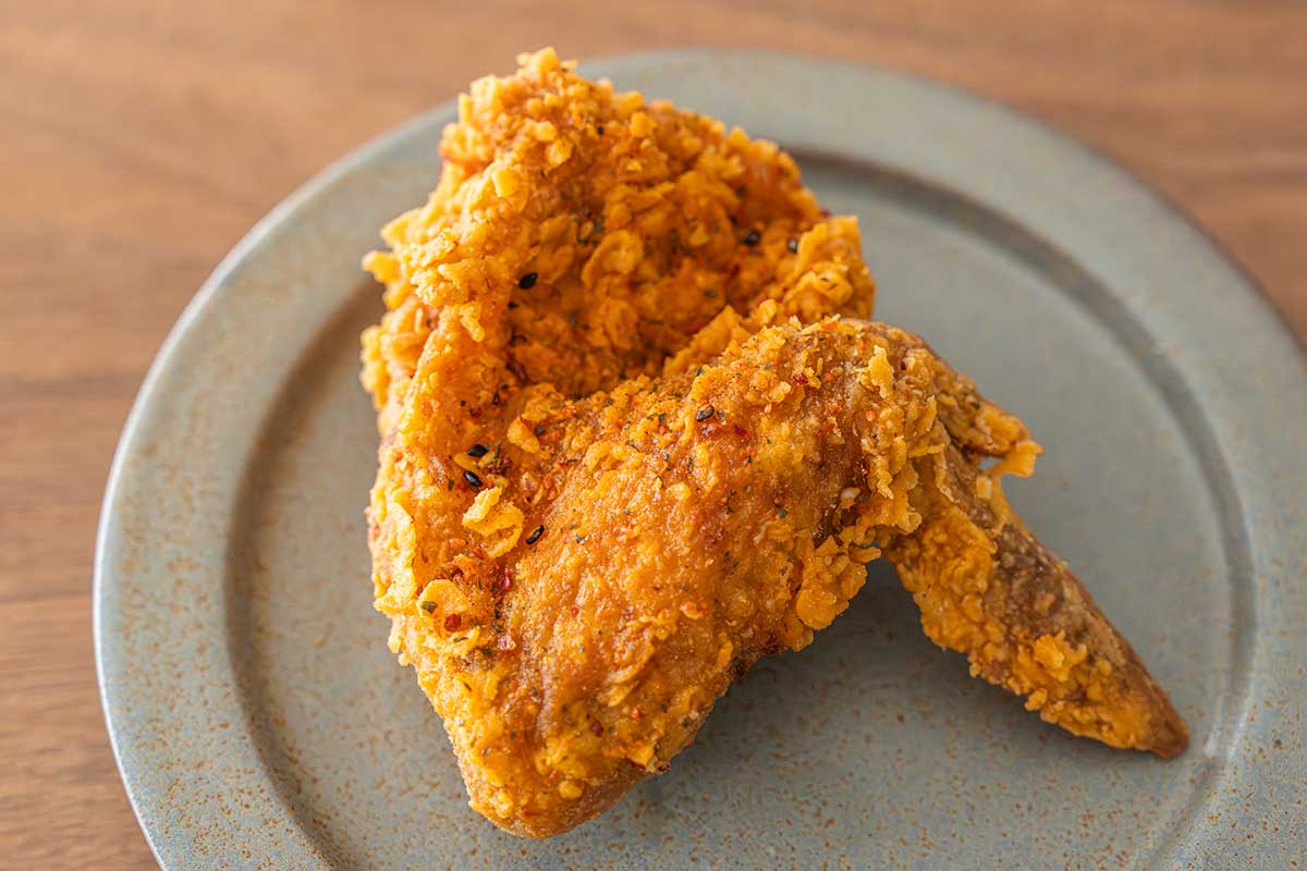 ザクッザクッとした軽快な食感の衣を噛みしめると、口の中にゆずの爽やかな香りと七味唐辛子の華やかな香りが広がります。肉汁が溢れ出すチキンは深みがあり、唐辛子のピリッとした辛みとベストマッチ。かつおや昆布のうまみを下味に使っているため、ゆずや七味唐辛子の風味との相性が抜群によいですね。