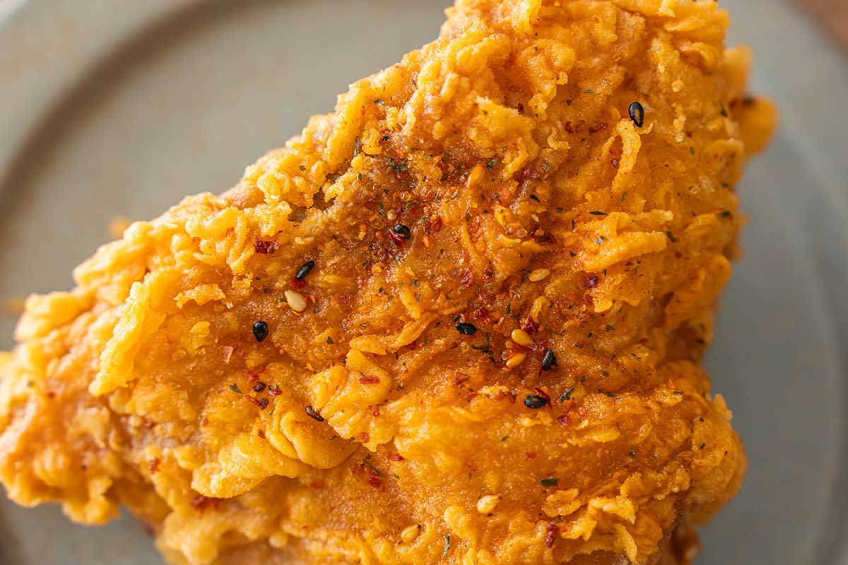 ケンタッキーフライドチキンの人気商品「レッドホットチキン」と同じようなタイプの衣で、表面には七味唐辛子がトッピングされています。