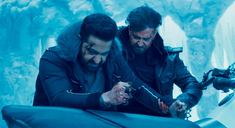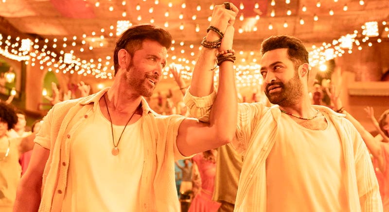 メイン写真では、傷を負いながらも鋭い眼光で敵を見据えるカビール(リティク・ローシャン)の姿が収められている。また、ヴィクラム(NTR Jr.)が炎の中を駆け抜けるアクションシーンの一幕も見られる。互いを信じ合っていたかつての2人が音楽と光に包まれながら踊る、“嵐の前の静けさ”とも言える様子も捉えられている。