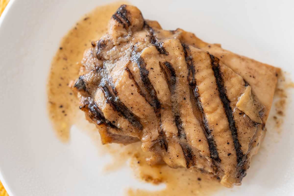 この商品は、にんにくとコショウでパンチのある味わいに仕立てた、鶏もも肉のステーキです。