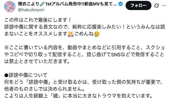誹謗中傷に関する長文なので、純粋に応援楽しみたい!というみんなは読まないことをオススメします🙇♀️ごめんね😢…— 博衣こより🧪1stアルバム発売中!!新曲MVも見てね🎉 (@hakuikoyori) November 4, 2025