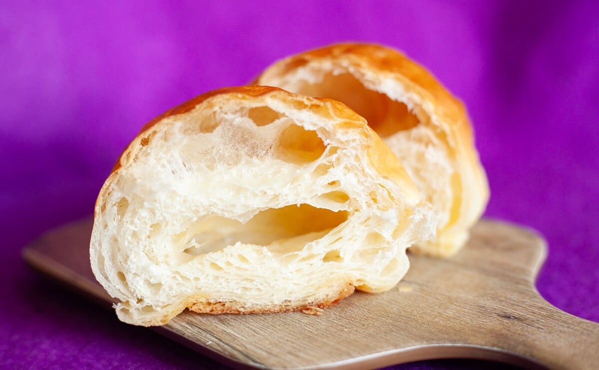 そして、こちらが半分に切った状態。中に何か入っているわけではなく、本当にシンプルなパンです。中はデニッシュのようになっている?
