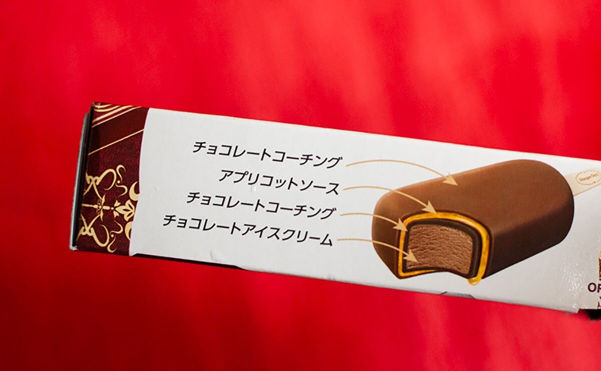 箱の横に、アイスのつくり(成り立ち?)が書いてありました。外から、チョコレートコーチング、アプリコットソース、チョコレートコーチング、チョコレートアイスクリーム。4層仕立てになっていて、贅沢感がありますよね。