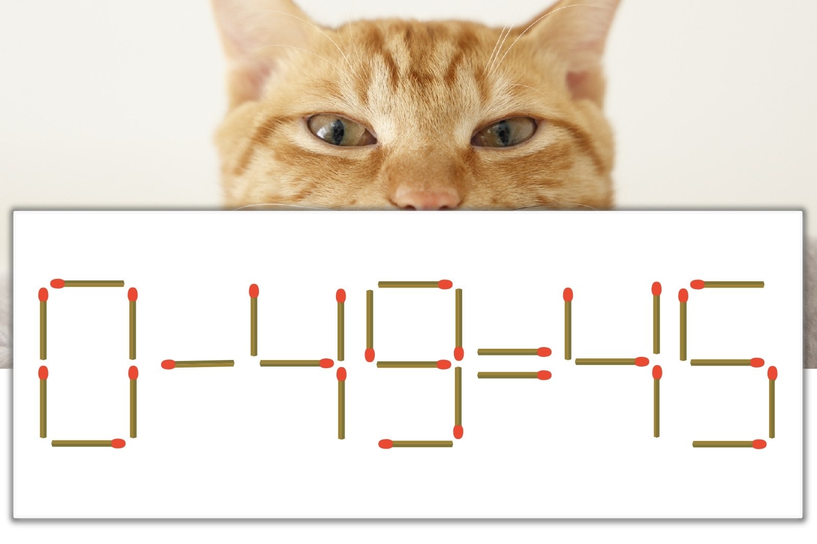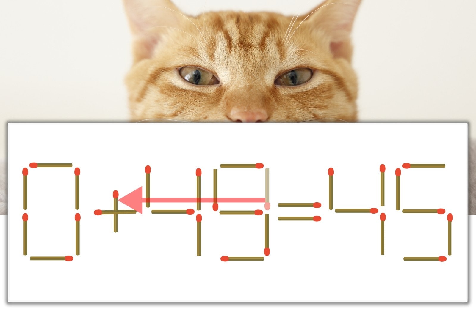 「9」を別の数字に変化させると答えが導き出せます。「9」のマッチ棒を1本移動して、「-」を「+」にしてみましょう。すると、「0+45=45」が成立します。