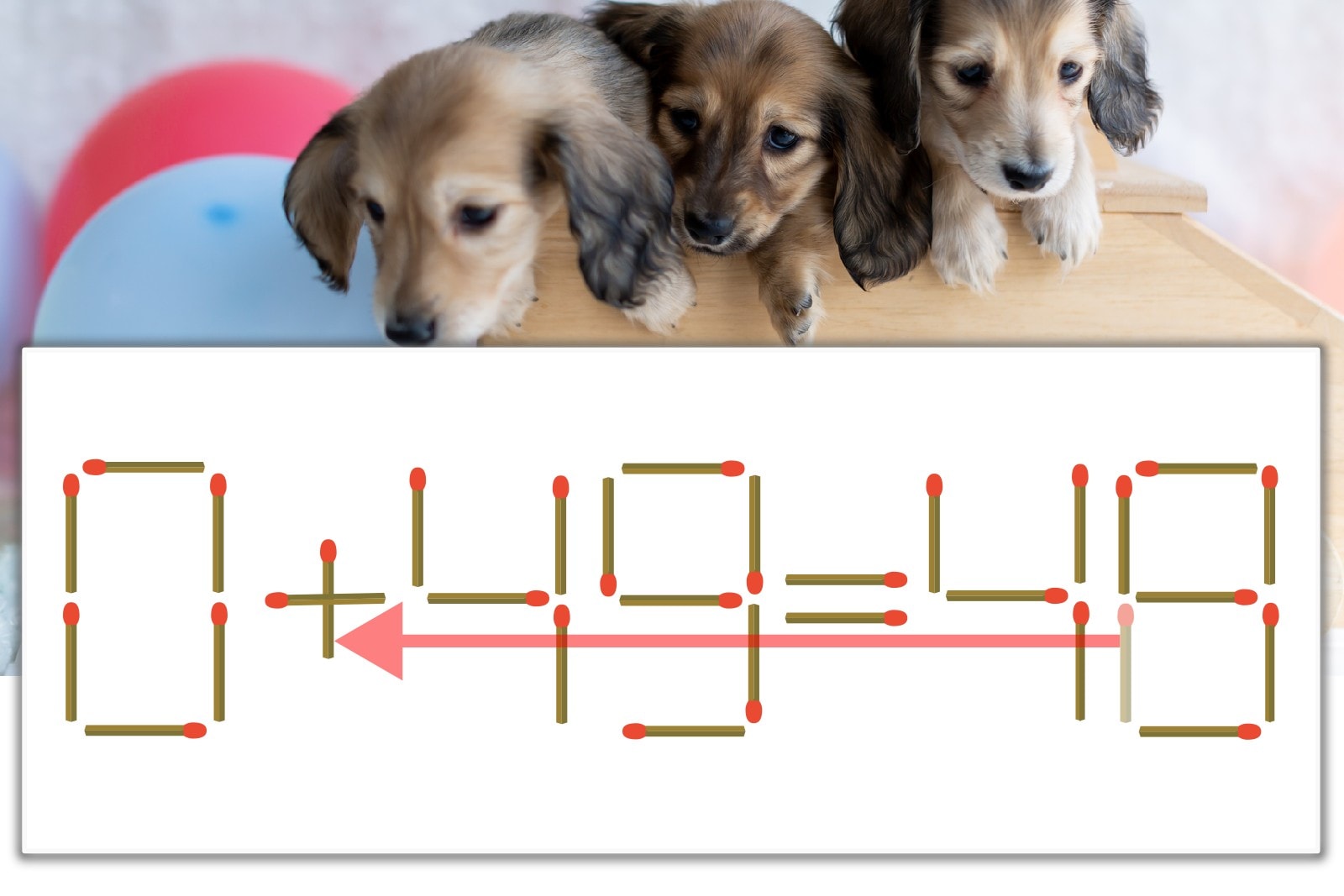 「8」を別の数字に変化させると答えが導き出せます。「8」のマッチ棒を1本移動して、「-」を「+」にしてみましょう。すると、「0+49=49」が成立します。