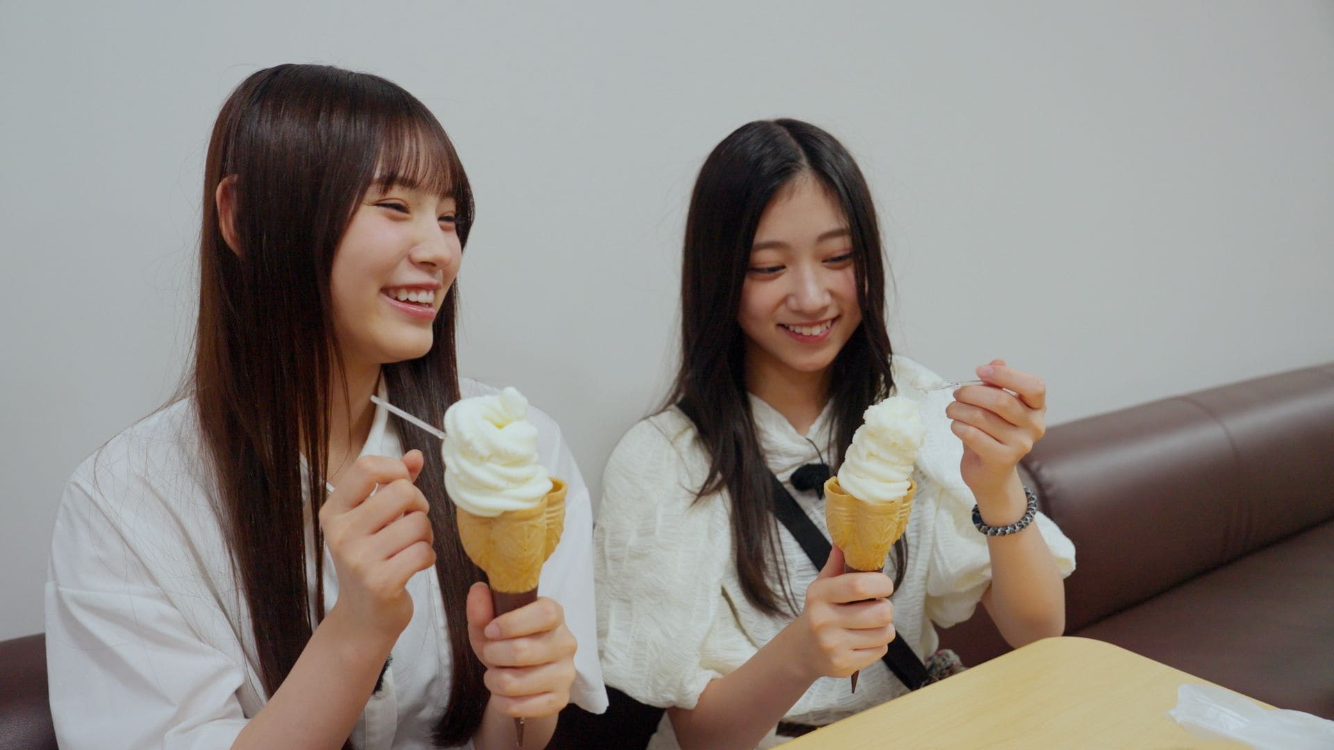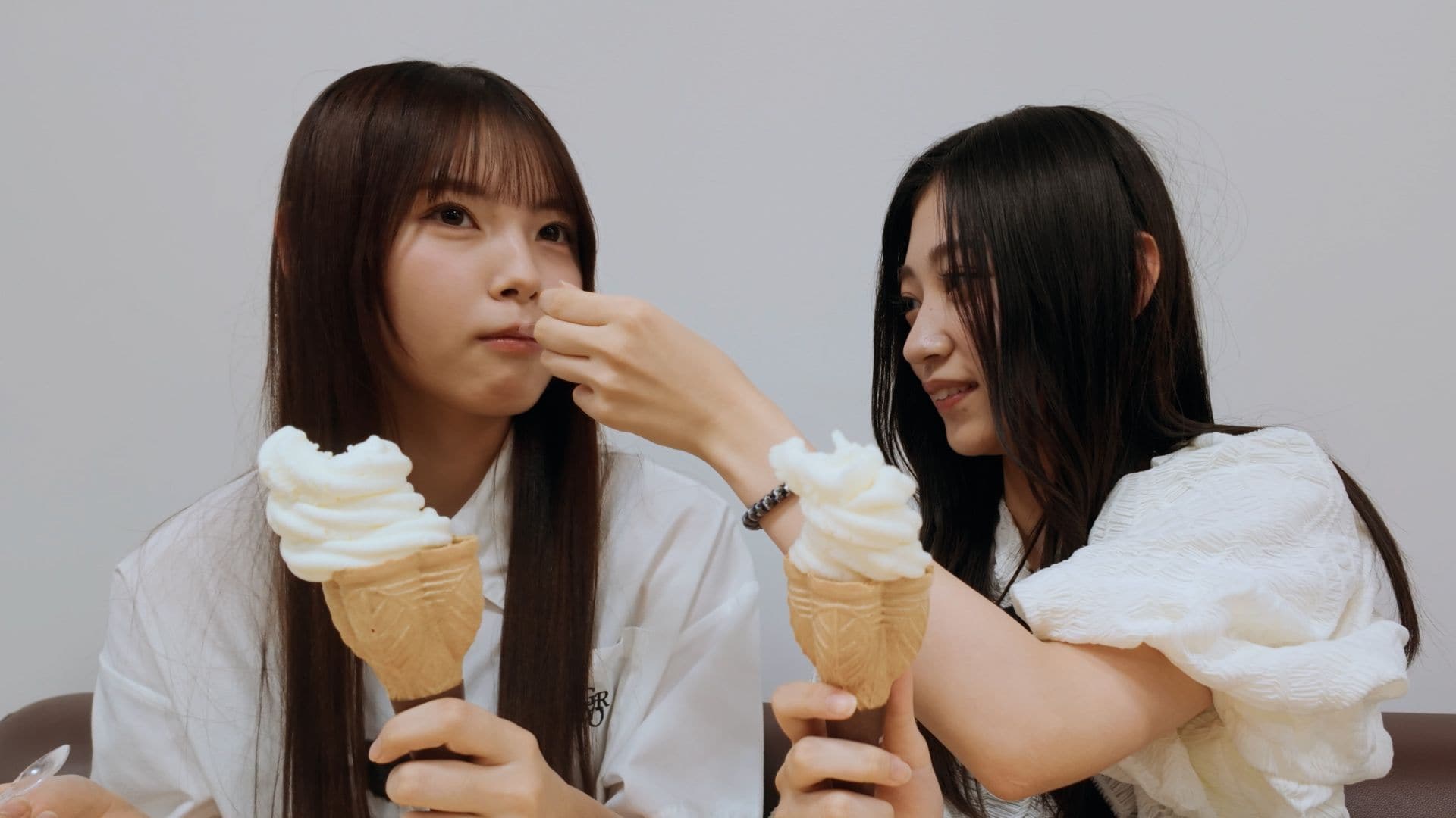 乃木坂46に加入してまだ1年足らずの6期生が、自分たちの知名度をあげるべく、さまざまな土地を旅する同番組。新潟に訪れ、おにぎり屋さんで初の取材許可に挑戦した“チーム東京”こと川端晃菜と森平麗心は、さっそく気になっていたソフトクリームを注文する。森平は塩ミルクを、川端は梨クリームのフレーバーを選び、2人は自分の選んだソフトクリームをお互いに食べさせ合い「めっちゃ濃厚!」「美味しい」と堪能した。