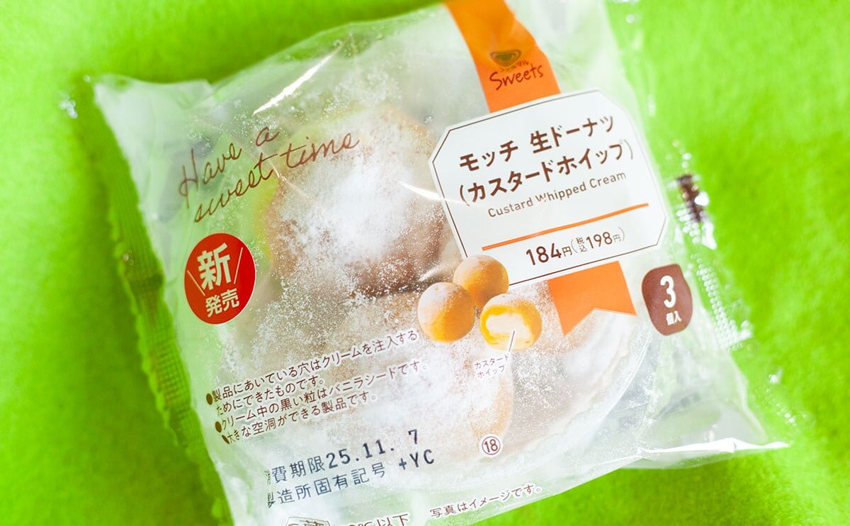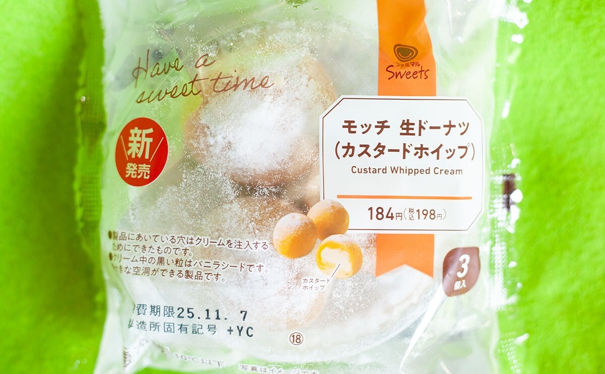 2025年11月4日(火)、ファミリーマートは、「モッチ生ドーナツ(カスタードホイップ)3個入」(税込198円)という新商品を発売しました。