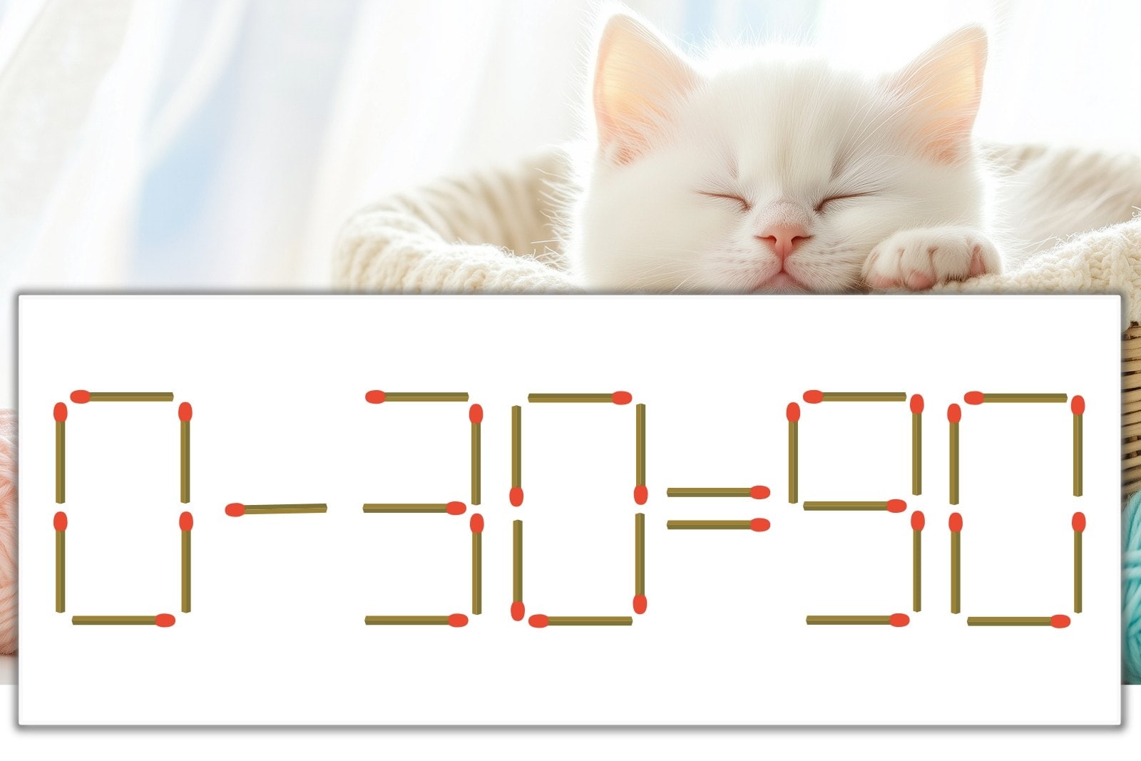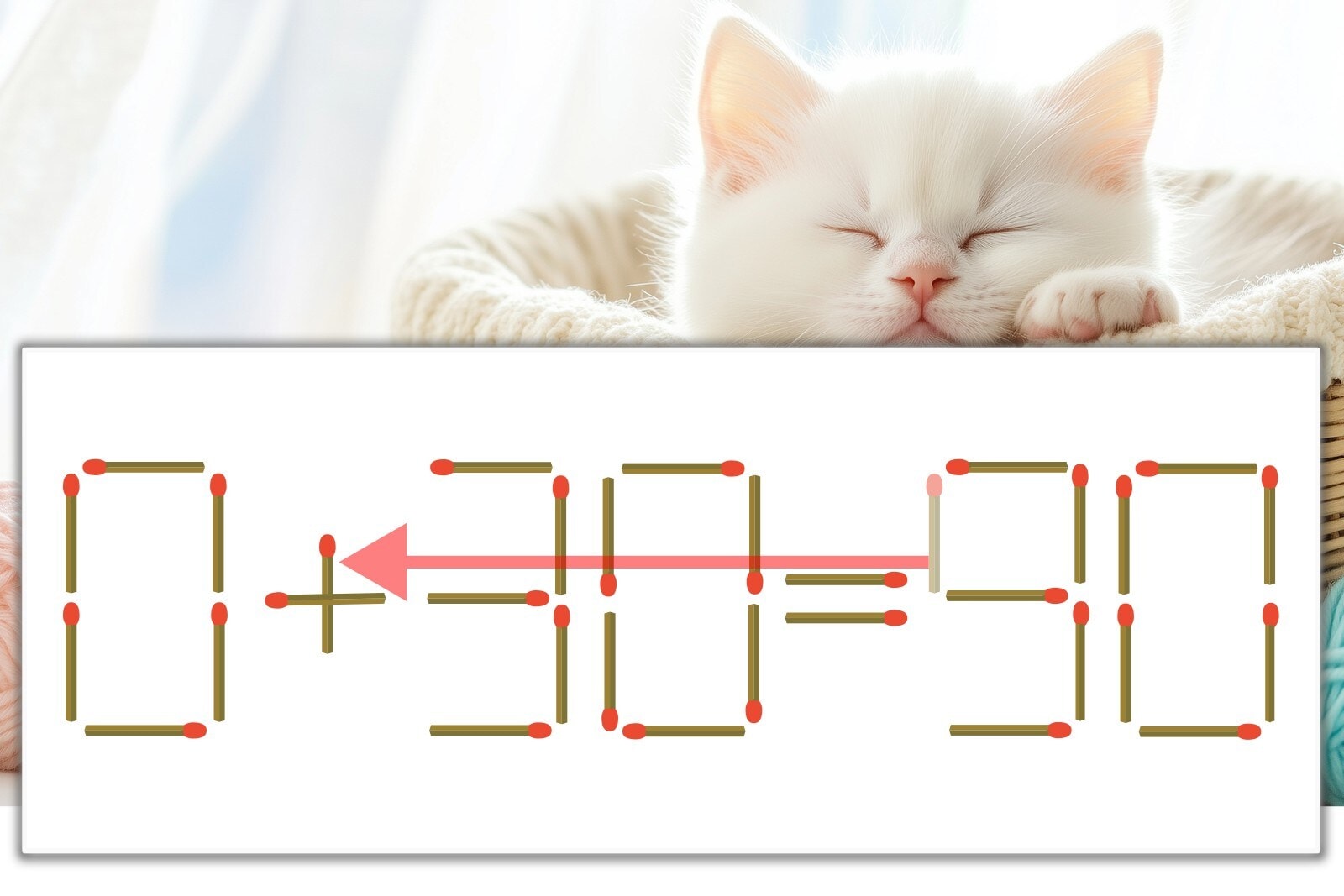 「9」を別の数字に変化させると答えが導き出せます。「9」のマッチ棒を1本移動して、「-」を「+」にしてみましょう。すると、「0+30=30」が成立します。