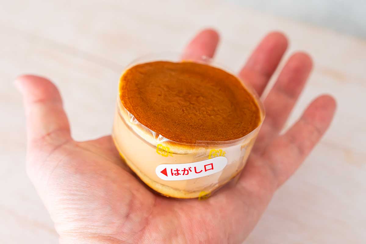 まずは「紅茶に恋する ミルクティーどら」を手のひらにのせてみました。どら焼生地のサイズ自体は大きくはないけれど、ホイップクリームに厚みがあるため、そこそこボリューム感はありますね。