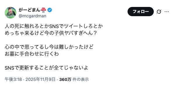 がーどまん、故・晋平太さんへの言及求める声に不快感 「今の子供ヤバすぎへん?」「SNSで更新することが全てじゃないよ」