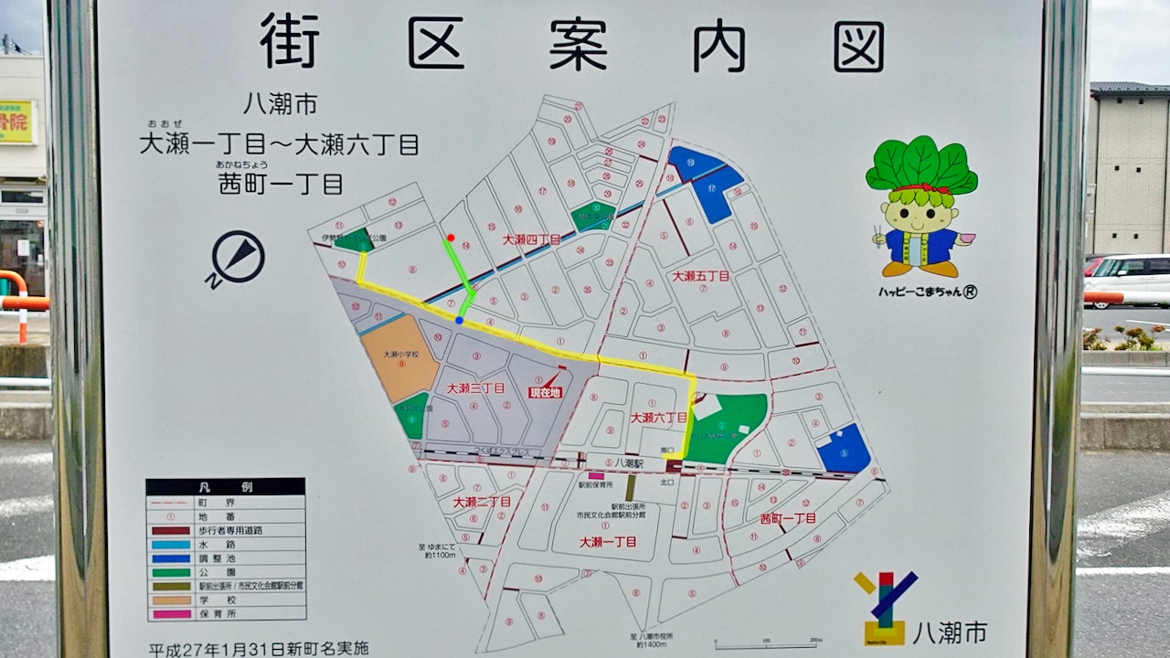 八潮市の「街区案内図」がありました。筆者の歩いたルート、黄色いラインが間違えて行きついた公園。八潮駅から1kmちょっとでした。