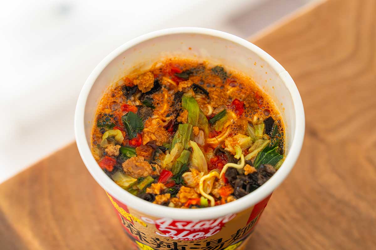 調理方法は、カップの中にお湯を注いで4分待ち、仕上げに「特製麻辣調味油」を加えて、よくかき混ぜるだけでOKです。