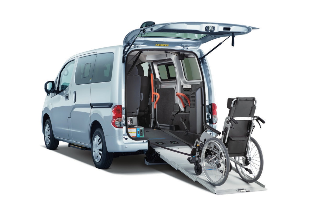 NV200バネット「チェアキャブ」は、車両後部のスロープから車いすのまま車内に乗り込める車両です。コンパクトで取り回しのしやすいボディサイズでありながら、充分な室内空間を確保している「NV200 バネット」の特長を活かし、主に病院や福祉施設の送迎車や介護タクシーなど、法人向けの需要に適した多人数乗りの車いす仕様車としています。使い方や乗車人数に合わせた3種類の室内レイアウトを設定しており、車いすやストレッチャーの乗員を含めて5~7名が乗車することが可能です。また、乗降用手すりやオートステップ、助手席スライドアップシート(オプション)などを装備することで、車いす乗員だけではなく、介助者や自力で歩行できる方にも乗降しやすい仕様としています。