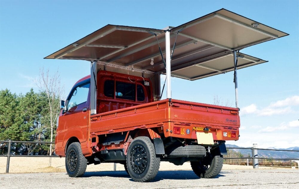 同社の「カーゴボックス」は、アルミとステンレスを用いた軽量かつ高耐久な構造が特徴。三方のパネルが開閉できる設計により、荷物の積み下ろしが格段にしやすく、開いた外板は日除けや雨除けとしても活用できる。アウトドアや車中泊、農業、建築業といった幅広いシーンに対応しており、まさに“使える荷台”を実現する装備といえる。