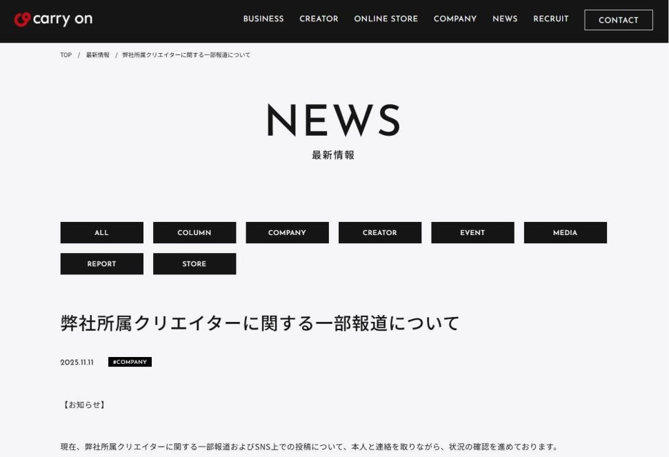 11月11日、株式会社Carry On(キャリオン)が所属クリエイターに関する一部報道について声明を発表しました。