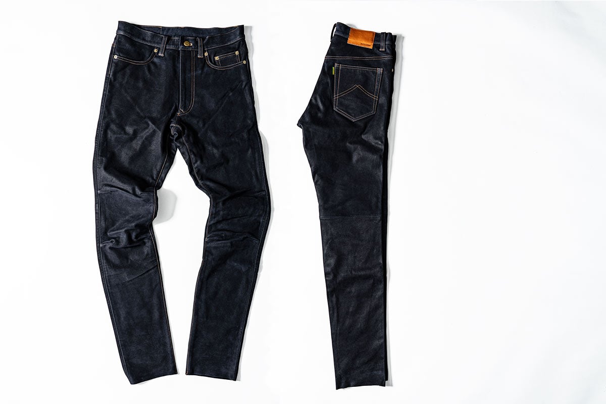 EX-1220(エクスプローラージーンズ)をベースに、ヒップから裾廻りにかけてスリムフィットなシルエットです。膝部にはダーツを設け立体的なパターンにしています。また皮革のストレッチ性を活かす目的で、裏地にはCOOLMAX®素材を採用しています。