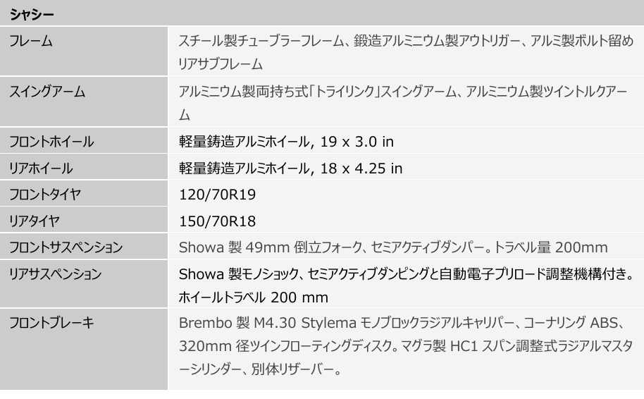 ブレーキシステムには、フロントに320mmツインディスクとBrembo製Stylemaキャリパー、リアに255mmシングルディスクを装備。確実な制動力と優れたコントロール性を両立しています。さらに、Alpine EditionにはメッツラーTourance