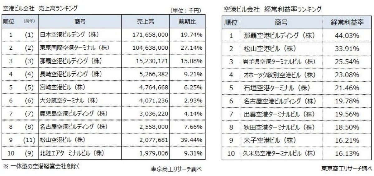 経常利益率は那覇空港ビルディングが44.0%で全国首位となりました。那覇空港の乗降客数は前年比11.1%増となり、過去最多を更新しました。(37社中)