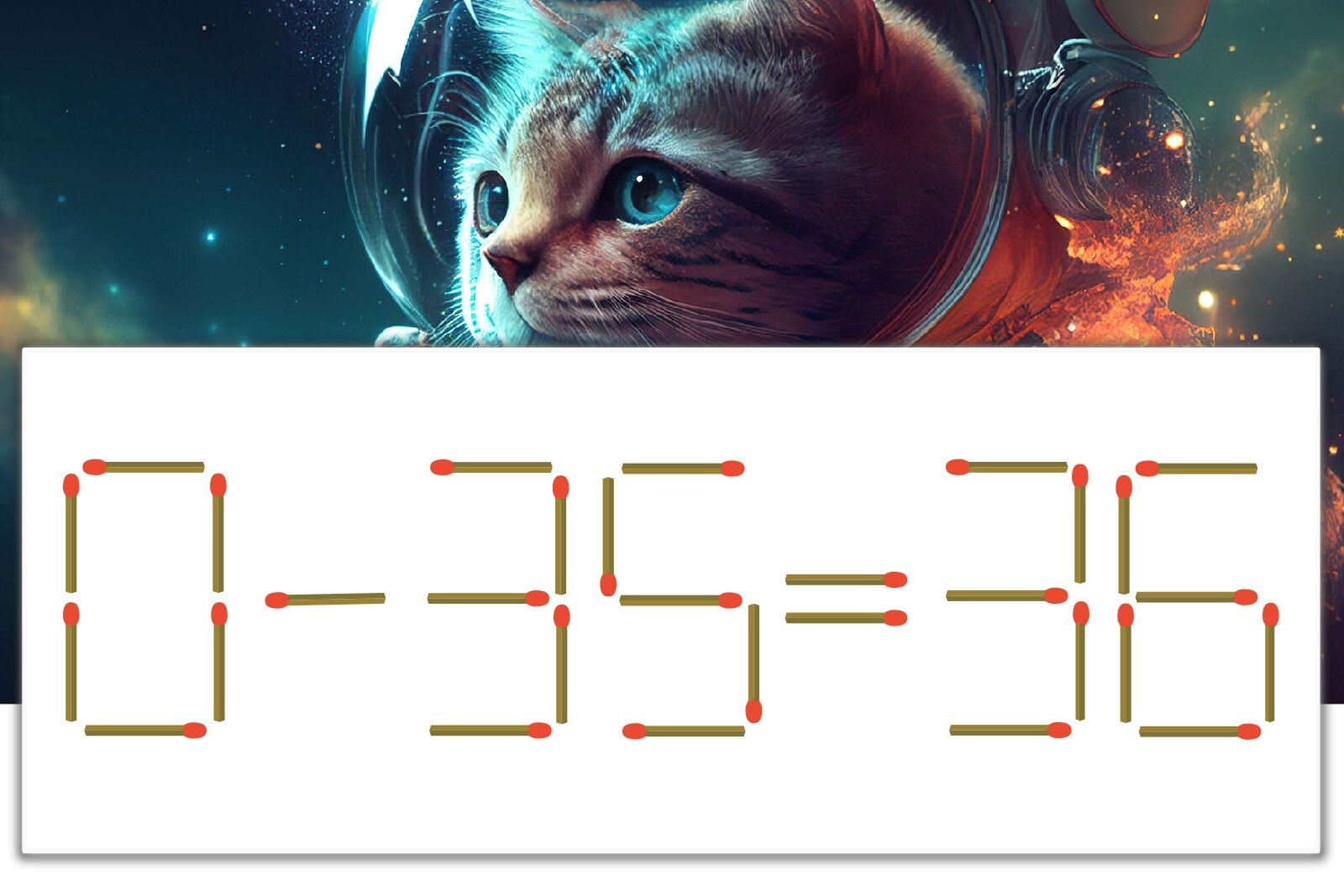 「6」を別の数字に変化させると答えが導き出せます。「6」のマッチ棒を1本移動して、「-」を「+」にしてみましょう。すると、「0+35=35」が成立します。