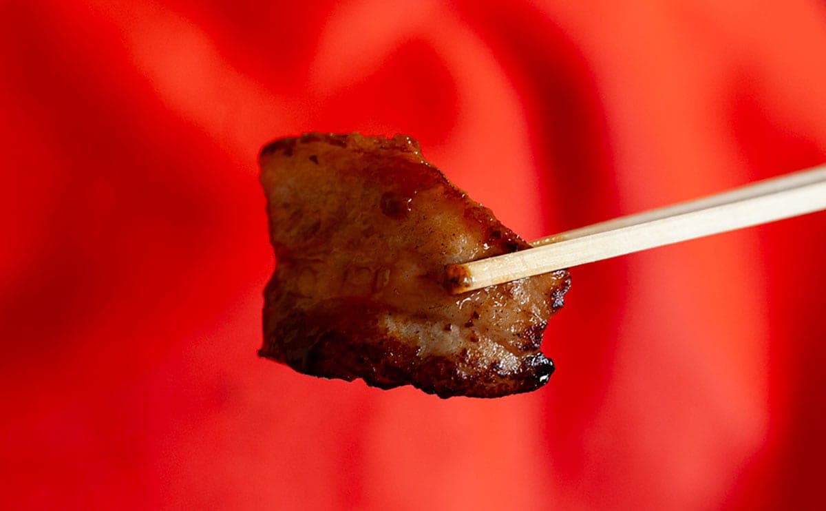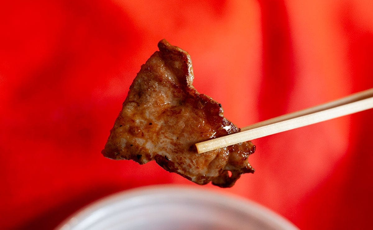 焼いたお肉の上に、ねぎがのったシンプルな一品ですね。わかりにくいかもしれませんが、左半分がカルビ、右半分がロースです。厚みや脂身の量が違うので、実際に見れば簡単にわかるはず。