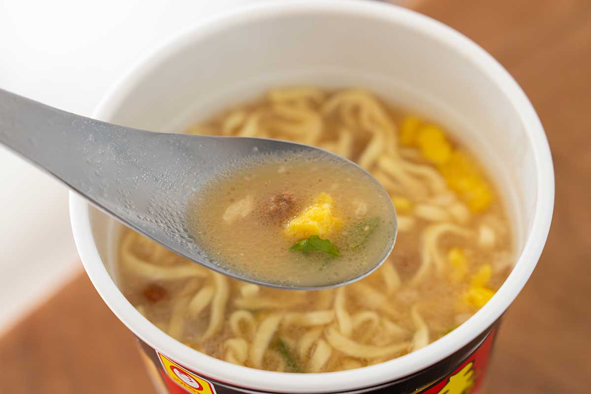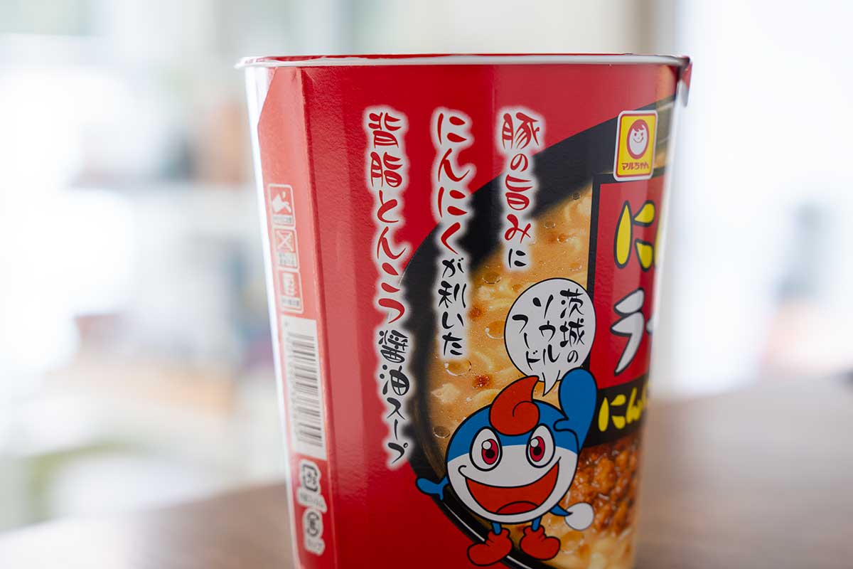 この商品は、茨城県の人気ラーメンチェーン「にんたまラーメン」が監修したカップ麺で、背脂とにんにくを利かせた豚骨醤油味スープが特長です。