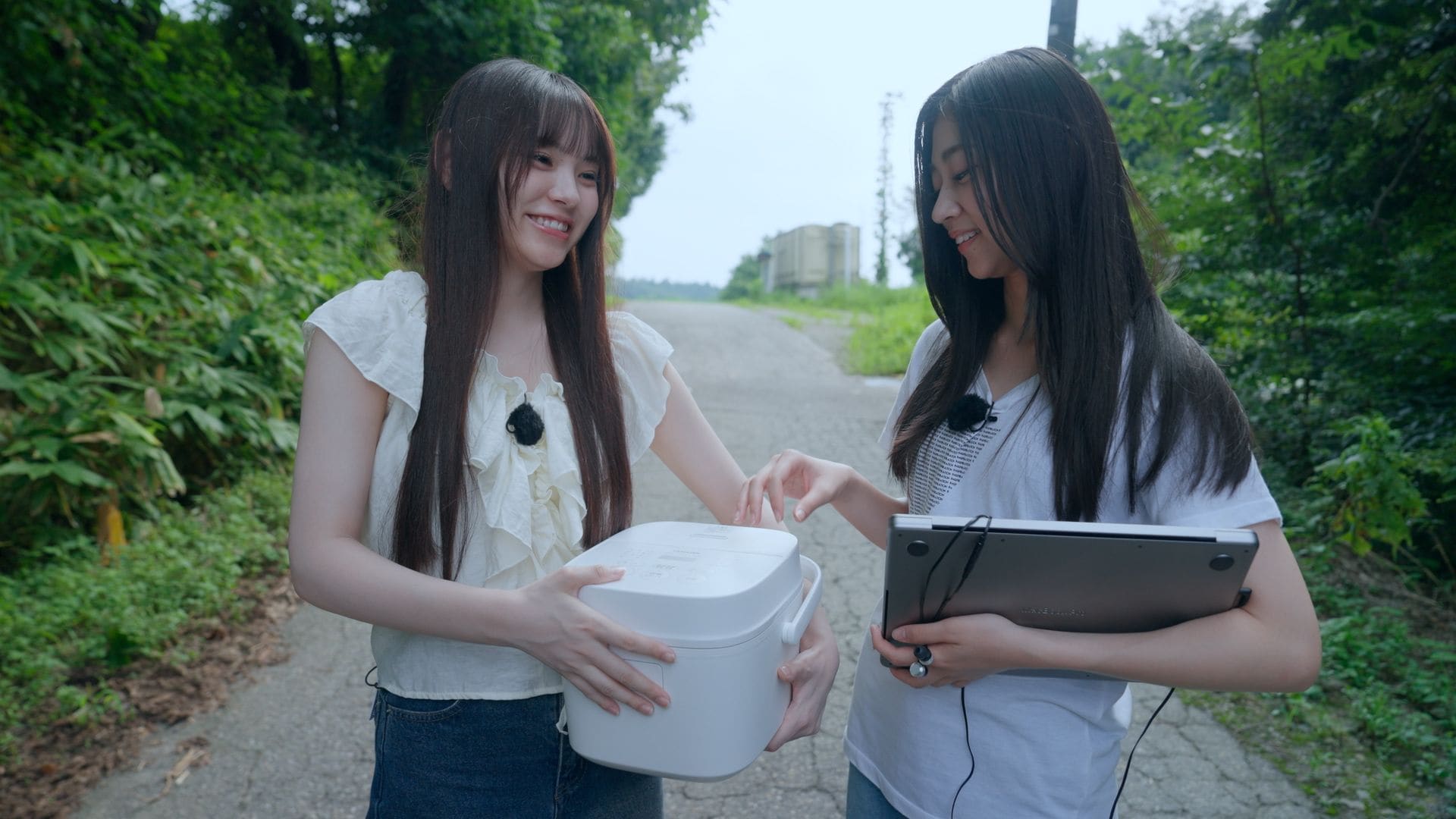2人は「なんか入っているのかな」と蓋を開けたが、中身は空っぽ。これを見た川端が「お米を収穫して中に入れて炊け?」と推測すると、察した森平は無言で炊飯器の蓋を閉じて苦笑い。「とりあえず炊飯器を持って旅しよう」という川端の声掛けで、2人は田んぼ道を散策することに。