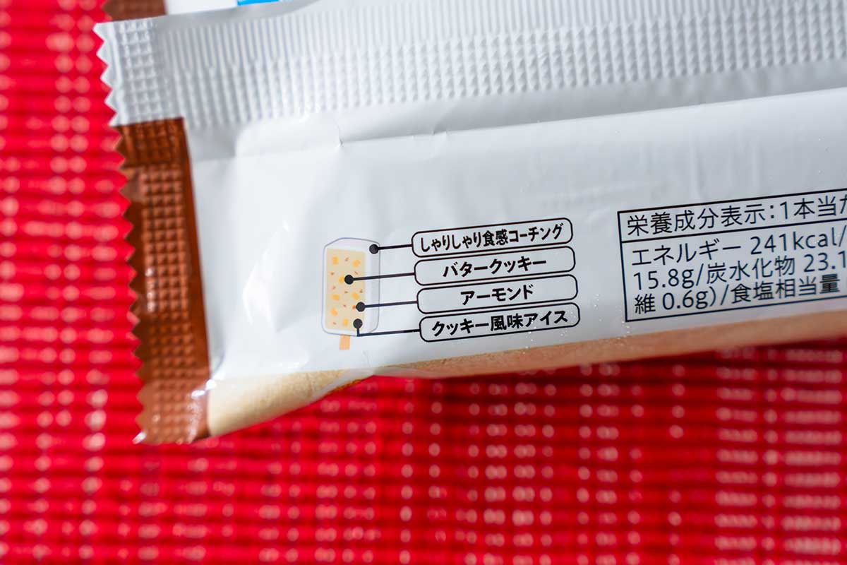 1本(80ml)当たりのエネルギーは241kcal、たんぱく質2.2g、脂質15.8g、炭水化物23.1g(糖質22.5g、食物繊維0.6g)、食塩相当量0.067g。種類別は「アイスミルク」、製造者は冒頭で触れた赤城乳業ですね。