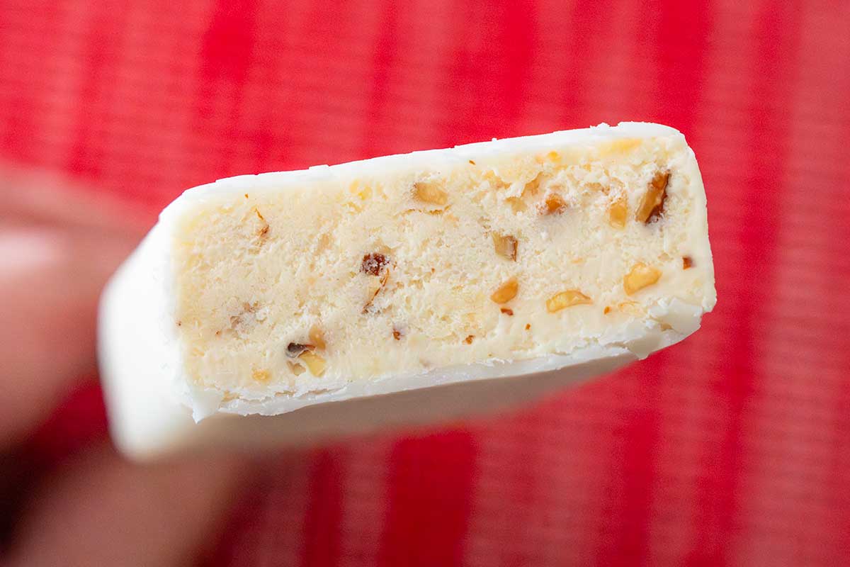 先端をカットして断面チェック。想像していた以上にアーモンドとバタークッキーが混ざっていました。
