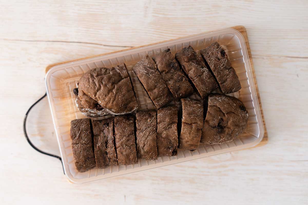 よく見ると、フランスパン生地の中に、チョコの塊のようなものが混ざっていますね。