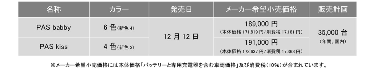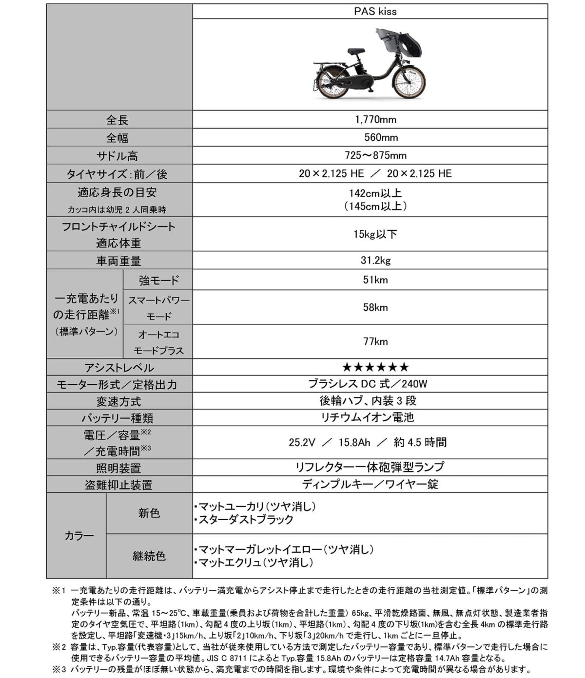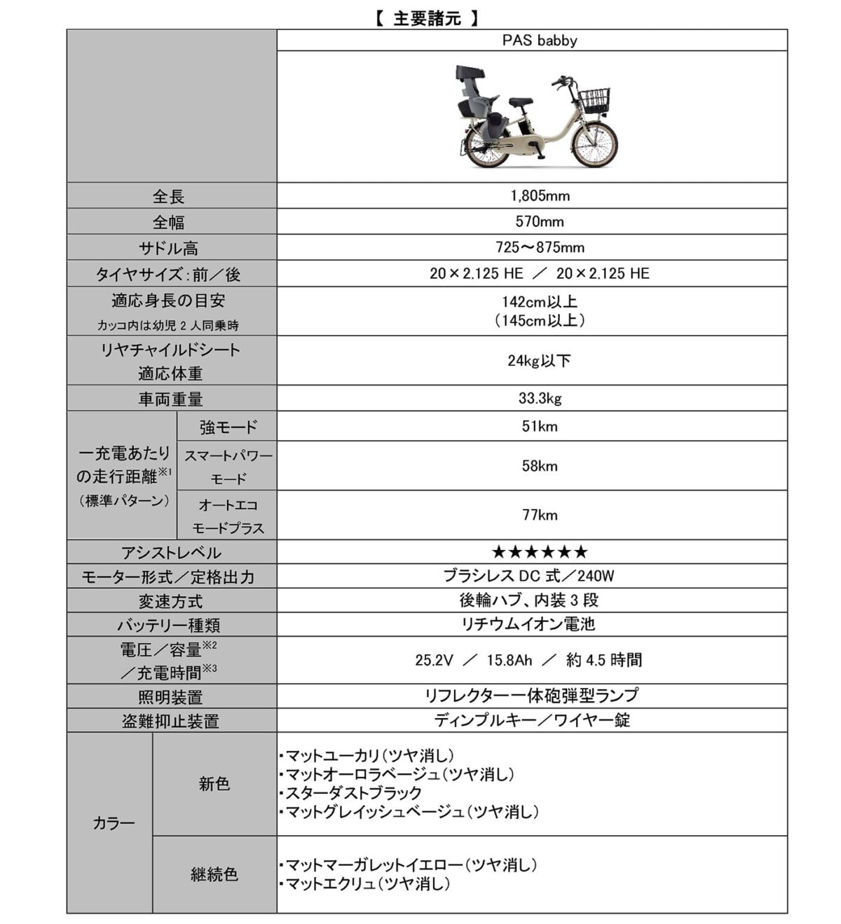 「PAS babby」は、オシャレなスタイリングが特徴の後ろ子ども乗せモデルで、日常での使いやすさや快適性にこだわったリヤチャイルドシート「ハグシートプラス」を搭載。「PAS kiss」は、ママ・パパの安心感、使いやすさ、快適性にこだわった前子ども乗せモデルで、お子さまを胸元まで包み込む繭型が特徴のフロントチャイルドシート「コクーンルームプラス」を搭載しています。