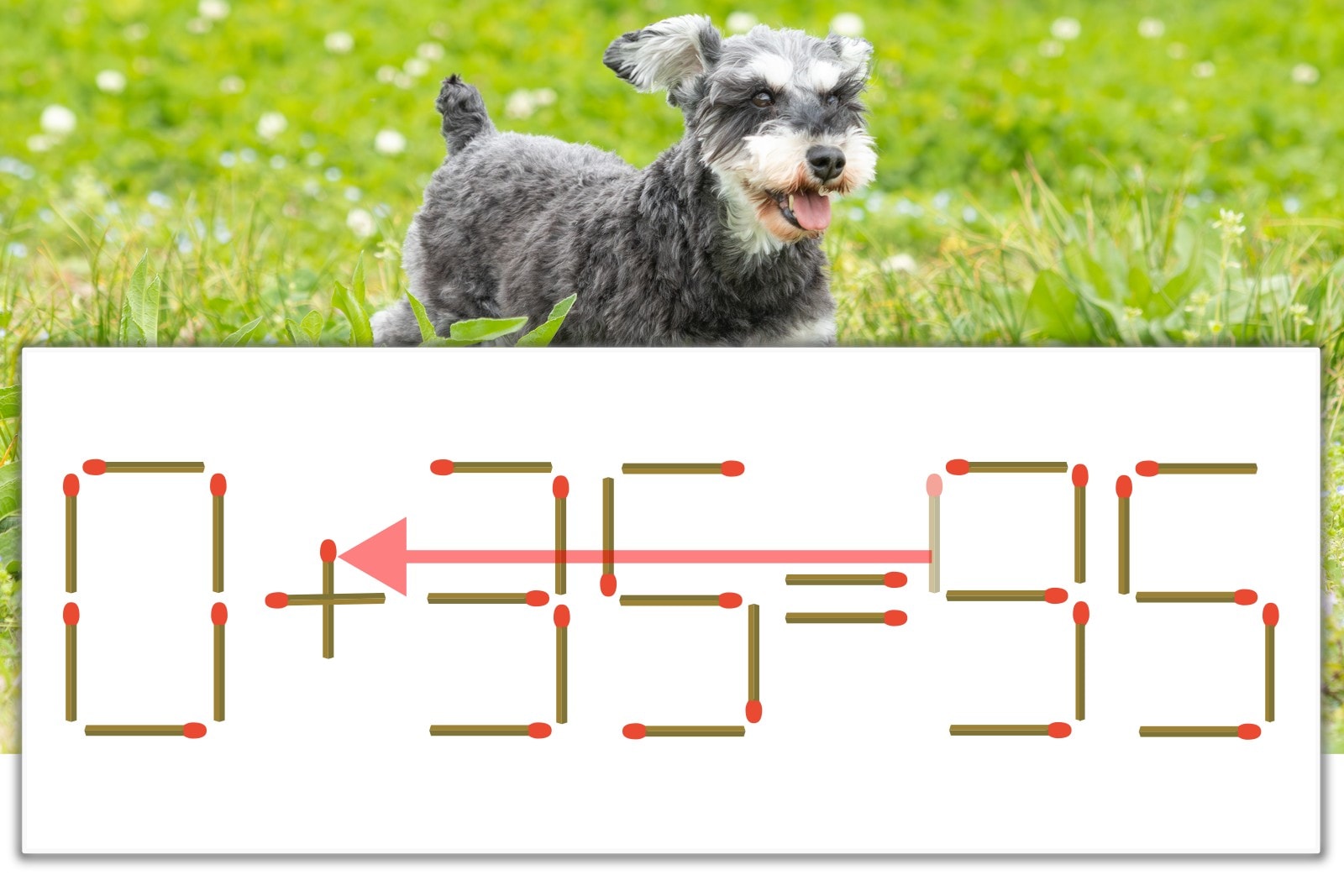 「9」を別の数字に変化させると答えが導き出せます。「9」のマッチ棒を1本移動して、「-」を「+」にしてみましょう。すると、「0+35=35」が成立します。