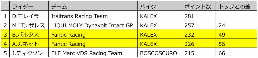 ライダーズランキングでは、バルタスがランキング3番手を確固たるものとし、カネットは4番手に浮上。あらためて、チームの総合力とバランスの高さを示す結果となった。